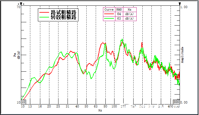 路面一致性良好。粗糙砂石轂面構造深度約3.5mm,粒徑6~8mm,測試結果可完美復現實(shí)際路面噪聲,幅值、頻譜高度相似,并且在長(cháng)時(shí)間、多次數的測試中表現出了良好的重復性。穩定的路面激勵源對平臺車(chē)型的路噪性能研發(fā)驗證工作也有重要意義。