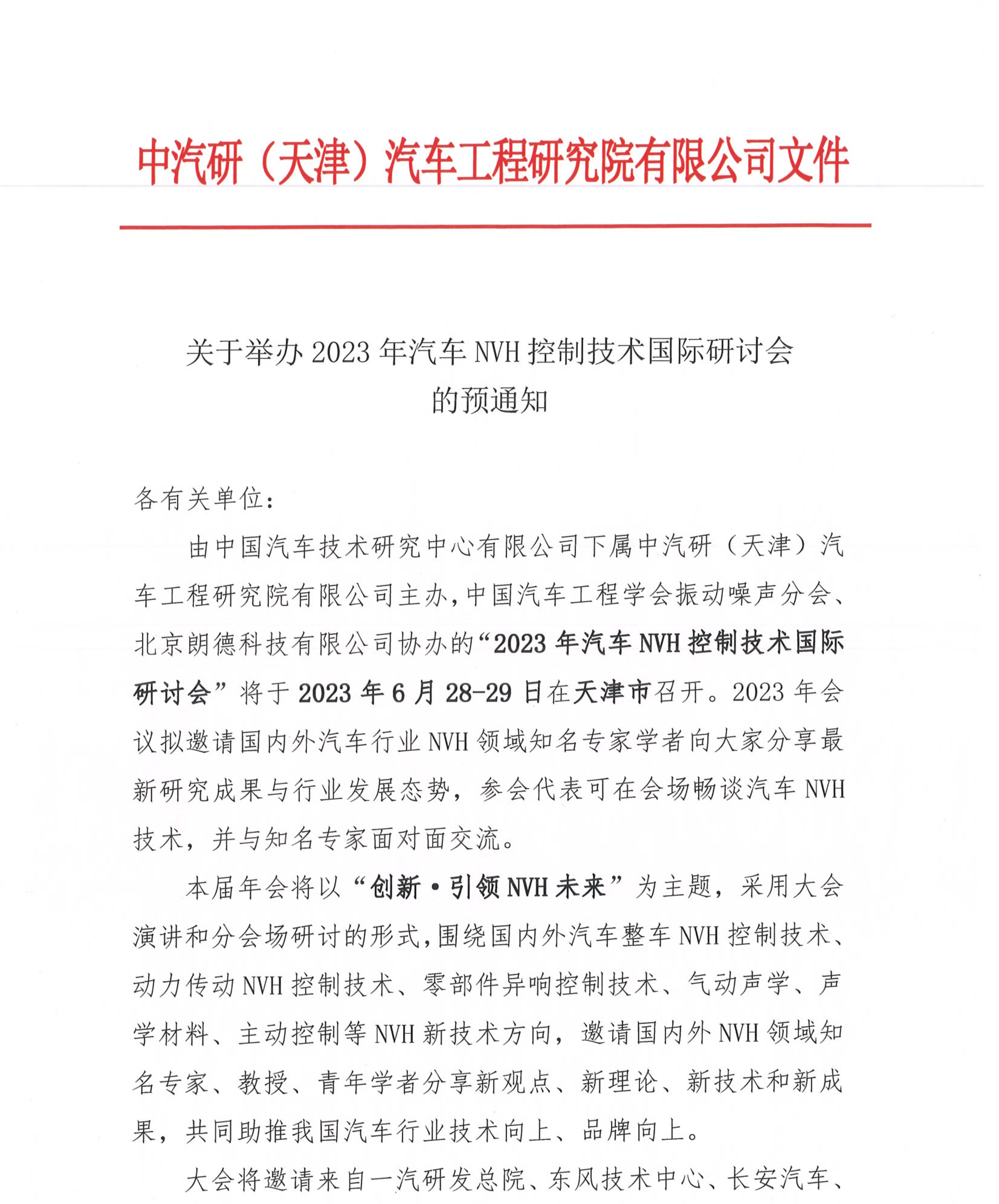 關(guān)于舉辦2023年汽車(chē)NVH控制技術(shù)國際研討會(huì )的預通知