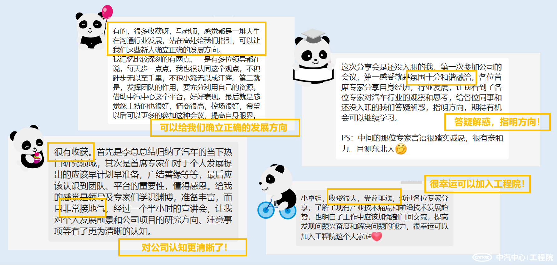 本次活動(dòng)以專(zhuān)家訪(fǎng)談的形式進(jìn)行,中汽中心資深首席專(zhuān)家、工程院黨委委員、副總經(jīng)理、總工程師李洪亮作開(kāi)場(chǎng)發(fā)言。隨后在主持人的引導下,各位專(zhuān)家在舒緩的音樂(lè )中娓娓道來(lái)、傾囊相授,分享了行業(yè)前沿需求及情況、科研成果積累經(jīng)驗、材料組織匯報技巧以及首席專(zhuān)家心路歷程等在前期調研中員工們最關(guān)心的重點(diǎn)方面,分享內容干貨滿(mǎn)滿(mǎn),整個(gè)過(guò)程溫馨愉快,傳遞出“低頭磨劍,抬頭趕路,心懷感恩,砥礪前行”的主旨,分享會(huì )收到在職員工及待入職同學(xué)的一致好評。此次活動(dòng)既推進(jìn)了人才隊伍建設,也是對企業(yè)文化在公司內外部的一次厚植。
