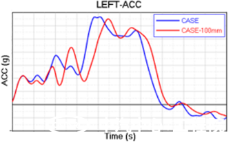 下圖是某款車(chē)型不同前艙吸能空間的影響分析,其中車(chē)型1較車(chē)型2增加了100mm的縱梁長(cháng)度。經(jīng)過(guò)計算分析,可以看出,前艙空間加大100mm后,車(chē)體及壁障加速度均出現了不同程度的緩和,碰撞歷程更長(cháng)。壁障的OLC指標從39g降低到了36g。