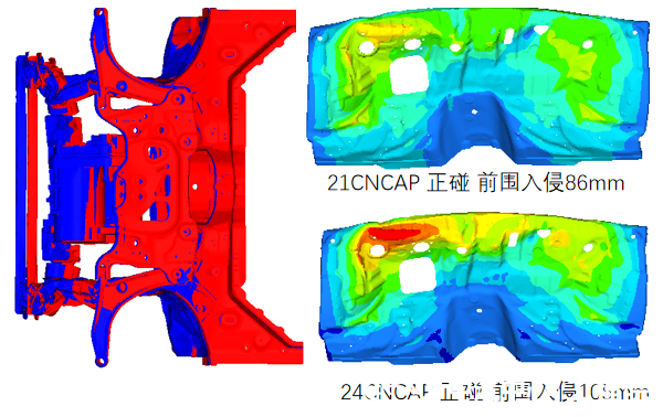 新型壁障SC-MDB的應用,對側面結構開(kāi)發(fā)提出了新的挑戰。下圖是某2021版C-NCAP五星車(chē)型的側碰CAE結果對比。