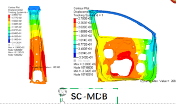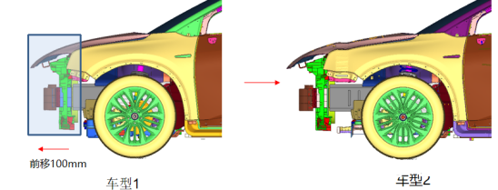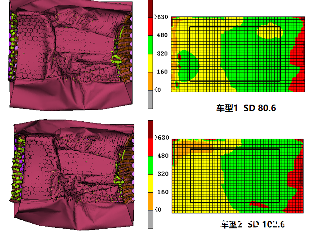 下圖是兩款不同結構車(chē)型的SD計算結果,其中車(chē)型1為含副車(chē)架傳力結構,車(chē)型2為不含副車(chē)架傳力結構??梢钥闯?,增加副車(chē)架傳力通道后,SD指標可以從100mm降至80mm,改善效果非常明顯。