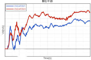2024版C-NCAP正碰工況由50km/h速度提升到了不低于55km/h碰撞速度。碰撞總能力提高了20%。這對前艙結構吸能提出了更大的挑戰。下圖是采用滿(mǎn)足2021版C-NCAP正碰開(kāi)發(fā)需求的車(chē)型,進(jìn)行2024版C-NCAP正碰分析對比結果??梢钥闯?,碰撞速度提升后,前艙被擠壓的量更大、前圍入侵超過(guò)了100mm,B柱加速度提高了10g。因此2021版C-NCAP正碰結構設計,并不能滿(mǎn)足2024版C-NCAP正碰開(kāi)發(fā)需求。