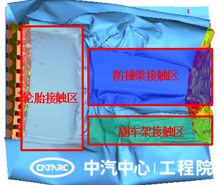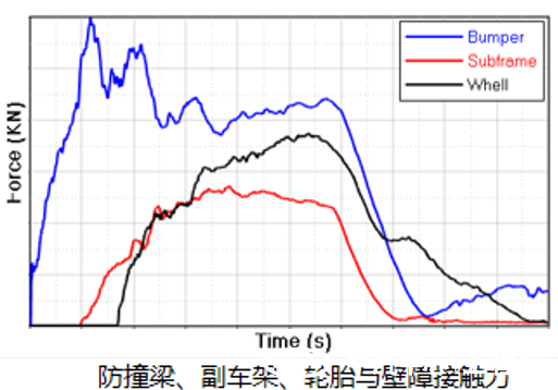 MPDB碰撞過(guò)程中,壁障與防撞梁、副車(chē)架及輪胎結構產(chǎn)生接觸,如下圖所示。接觸產(chǎn)生較大的碰撞力,其中輪胎與壁障的接觸面積較大,受力平臺在60~80KN之間,高于副車(chē)架結構受力,對MPDB壁障產(chǎn)生的沖擊較大。不同接觸區域的車(chē)身結構剛度不同,導致壁障蜂窩鋁的變形出現不均勻現象,引起SD指標的變化。