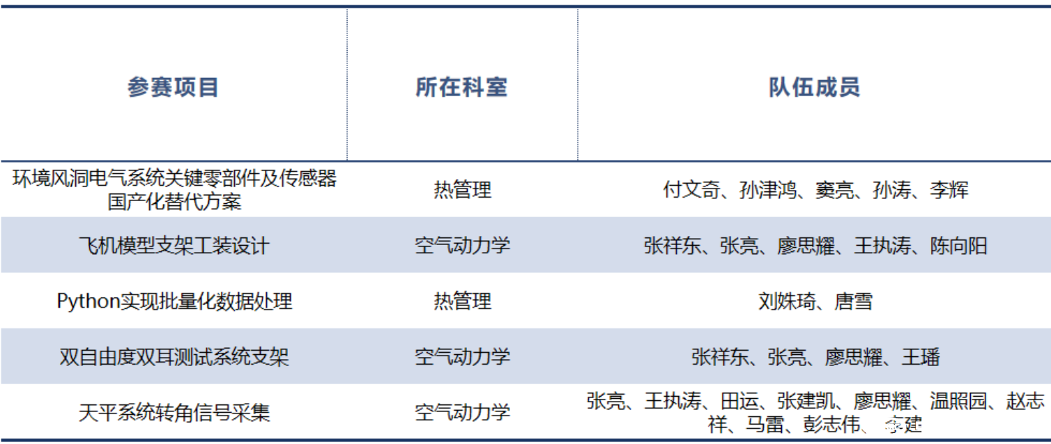 本次微創(chuàng )新大賽共收到18項創(chuàng )意方案,涵蓋了風(fēng)洞測試的準備工作、測試過(guò)程、設備運維以及開(kāi)發(fā)數據處理四個(gè)方面。這些方案提出了各類(lèi)創(chuàng )新小發(fā)明和工作新方法,不僅解決了大家在工作中經(jīng)常遇到的共性問(wèn)題、顯著(zhù)地提高了工作效率,還激發(fā)了大家創(chuàng )新思維,為不斷適應未來(lái)快速變化的行業(yè)需求打下了堅實(shí)的基礎。最終,通過(guò)為期兩個(gè)月的內部互評和技術(shù)評比小組評判,獲得總分前五名的參賽項目和成員如下: