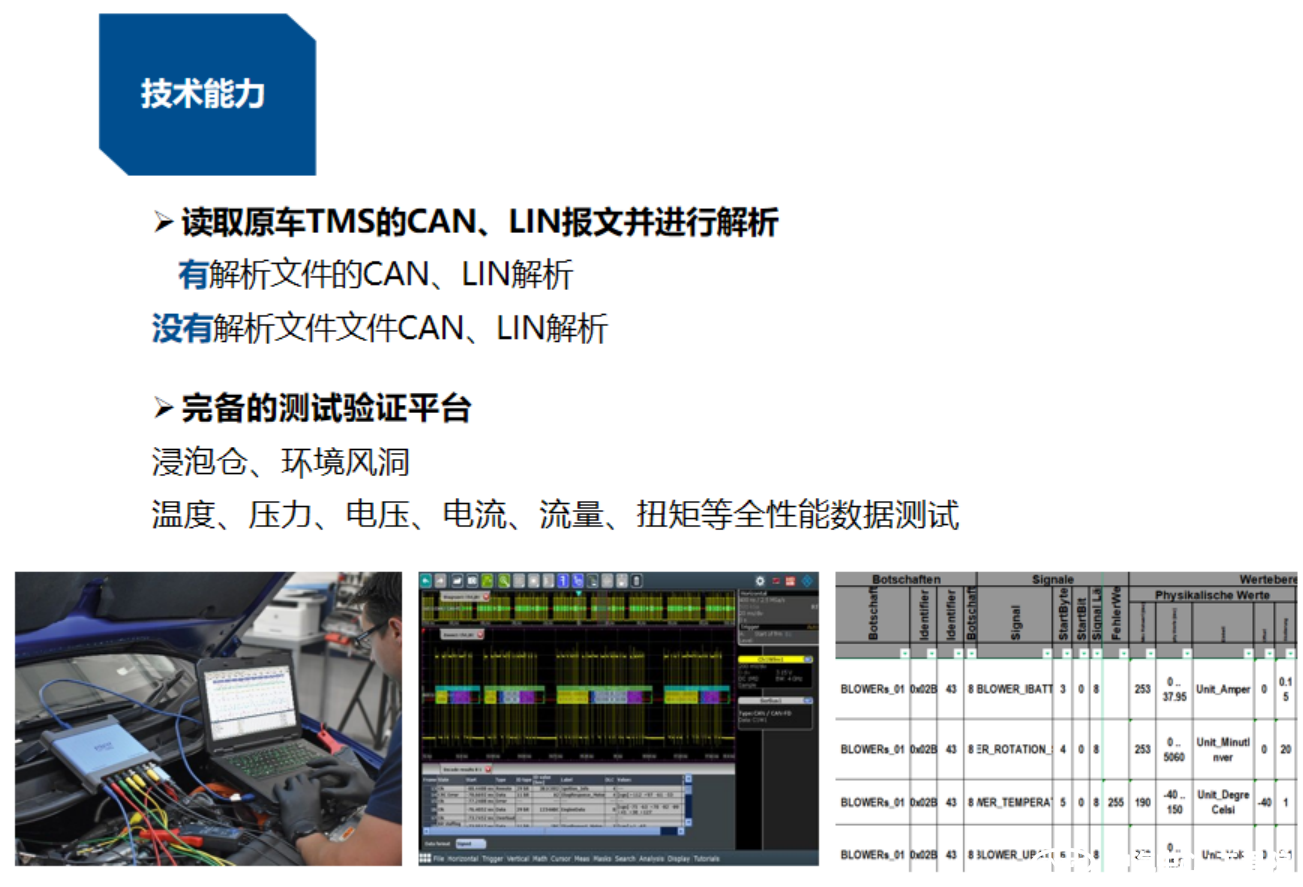 針對不同車(chē)型和熱管理架構系統,建立熱系統控制策略解析流程,定制化制定策略解析工況。目前團隊具備了對各熱系統部件控制通信的CAN、LIN解析能力,同時(shí)可讀取原車(chē)熱系統的CAN、LIN報文并進(jìn)行解析的能力,通過(guò)整車(chē)布置全性能數據測試的傳感器,可實(shí)現對熱系統控制策略更為全面詳細的解析。