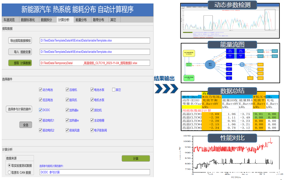 基于熱管理系統測試數據,通過(guò)數據自動(dòng)化分析工具,可快速實(shí)現競品車(chē)之間熱系統性能對比,為熱系統性能和控制策略?xún)?yōu)化提供依據和方向。同時(shí),還可清晰梳理出熱系統的能耗情況,并羅列出各部件的詳細能耗,快速鎖定高能耗關(guān)鍵部件,方便以基于降能耗為目標的控制策略?xún)?yōu)化。