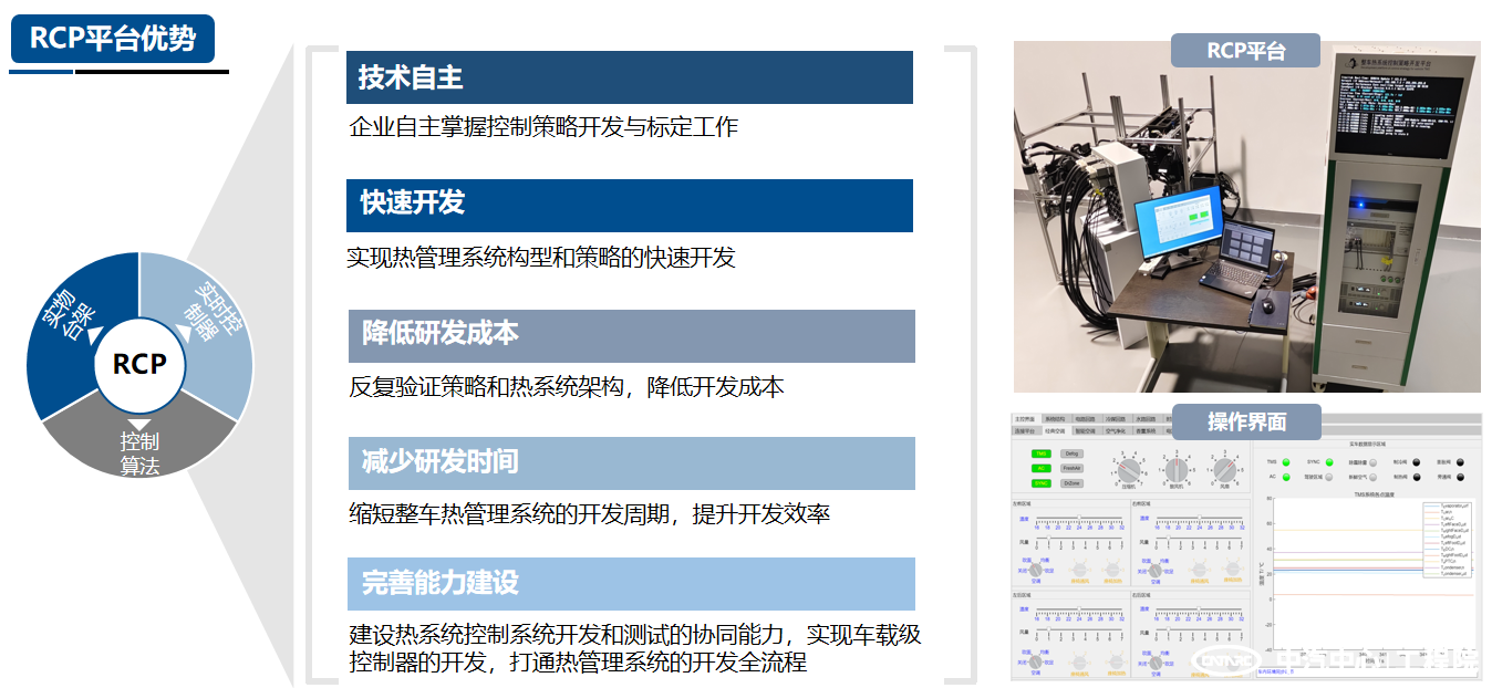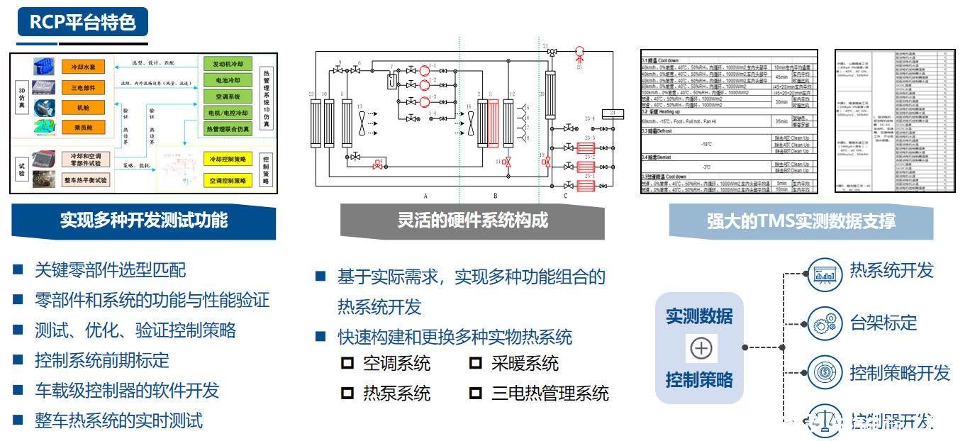 熱系統及零部件性能開(kāi)發(fā)和匹配:該快速控制原型平臺搭建了靈活的實(shí)物熱系統臺架,配置多種通用的空調回路和水回路接口,可快速實(shí)現多種功能組合的熱系統構型開(kāi)發(fā)。同時(shí)該平臺安裝了豐富的熱系統傳感器和測試數據采集模塊,可對熱系統實(shí)物臺架進(jìn)行系統級和零部件級的性能測試。