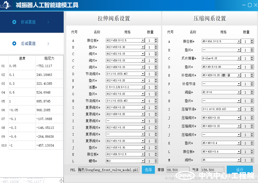 該工具以被動(dòng)型減振器為對象,支持底盤(pán)調教方案的快速評估。底盤(pán)調校工程師只需要輸入減振器閥系的安裝規格參數,即可智能預測該結構下的減振器速度特性曲線(xiàn),實(shí)現減振器結構與阻尼力的數據化表達。該工具的外特性預測結果相較減振器臺架測試結果準確率達90%以上。