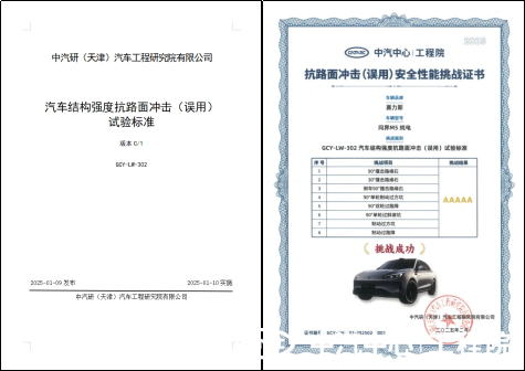 此次開(kāi)展的性能挑戰嚴格遵循中汽中心工程院制定的GCY-LW-302汽車(chē)結構強度抗路面沖擊(誤用)試驗標準,全方位模擬了8類(lèi)極端誤用工況,包含 90°撞擊路緣石、30°撞擊路緣石、倒車(chē)90°撞擊路緣石、90°單輪制動(dòng)過(guò)方坑、90°雙輪過(guò)路障、90°單輪過(guò)斜坡坑、制動(dòng)過(guò)方坑、制動(dòng)過(guò)路障等復雜場(chǎng)景。問(wèn)界新M5純電憑借前雙叉臂與后H臂多連桿懸架設計、漸進(jìn)式多腔體緩沖塊等創(chuàng )新技術(shù),在測試中展現了優(yōu)異的性能,實(shí)現了整車(chē)無(wú)變形的“五A級”全優(yōu)表現,并獲得了 “抗路面沖擊(誤用)安全性能001號證書(shū)”。這不僅驗證了該車(chē)型在極端場(chǎng)景下具備可靠性冗余,也標志著(zhù)我們已在結構強度抗路面沖擊性能研究領(lǐng)域取得了重要進(jìn)展。