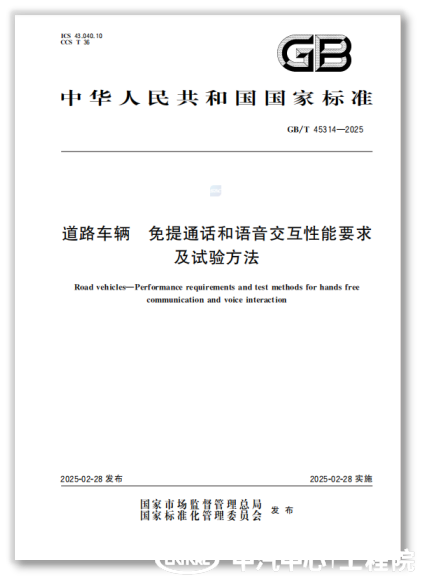 1. 我國重要國家標準GB/T 45314-2025《道路車(chē)輛免提通話(huà)和語(yǔ)音交互性能要求及試驗方法》于2025年2月18日正式發(fā)布,由中汽中心牽頭制定,系統規范了車(chē)載免提通話(huà)、語(yǔ)音交互、eCall緊急呼叫系統等領(lǐng)域的測試方法。該標準填補了國內車(chē)載語(yǔ)音通信質(zhì)量測試標準相關(guān)領(lǐng)域的空白,顯著(zhù)提升我國車(chē)載語(yǔ)音交互系統的質(zhì)量水平和國際競爭力。