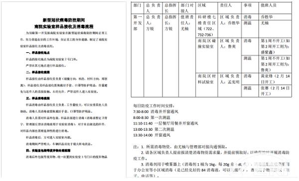 2月5日,疫情防控小組制定《南院實(shí)驗室樣品接收及消毒流程》。2月9日,下發(fā)《第1周復工實(shí)施方案》,明確復工后座位圖。